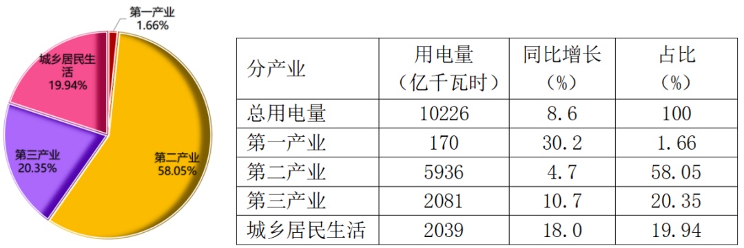 在持续高温高湿天气拉动下,7月份全国多地负荷创新高,当月全社会用电量首次突破1万亿千瓦时,达10226亿千瓦时,同比增长8.6%,增速比上月加快3.2个百分点。从分产业用电看,第一产业用电量170亿千瓦时,同比增长20.2%;第二产业用电量5936亿千瓦时,同比增长4.7%;第三产业用电量2081亿千瓦时,同比增长10.7%;城乡居民生活用电量2039亿千瓦时,同比增长18.0%。1—7月,全社会用电量累计58633亿千瓦时,同比增长4.5%,其中规模以上工业发电量为54703亿千瓦时。从分产业用电看,第一产业用电量847亿千瓦时,同比增长10.8%;第二产业用电量37403亿千瓦时,同比增长2.8%;第三产业用电量11251亿千瓦时,同比增长7.8%;城乡居民生活用电量9132亿千瓦时,同比增长7.6%。