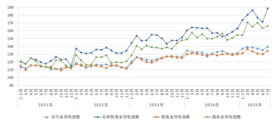 根据中电联发布的2025年7月全国电力消费系列指数(CNECI),2025年7月,全国全行业用电指数为139.9,全行业用电量比2020年基期(以2020年基期为100)增长了39.9%,年均增长6.9%,同比增长6.5%,增速比上月提高1.9个百分点。7月,农林牧渔业用电指数为188.8,同比增长20.2%。制造业用电指数为134.4,同比增长3.1%,增速比上月提高1.0个百分点。其中:四大高载能行业用电指数为124.6,同比增长0.5%,增速比上月提高1.2个百分点;高技术及装备制造业用电指数为154.5,同比增长7.3%,增速比上月提高1.4个百分点;消费品制造业用电指数为128.6,同比增长1.6%,增速与上月接近。7月,服务业用电指数为166.1,同比增长10.7%,增速比上月提高1.7个百分点。其中在AI、大数据、5G等快速发展带动下,信息传输、软件和信息技术服务业用电指数为173.9,同比增长18.9%,虽增速略有回落,但仍延续快速增长势头;在电动汽车高速发展带动下,“十四五”以来充换电服务业用电量保持高速增长势头,充换电服务业用电指数为1039.1,同比增长43.6%,增速比上月提高1.7个百分点;交通运输、仓储和邮政业用电指数为150.7,同比增长9.0%,增速比上月提高3.0个百分点;住宿和餐饮业用电指数为168.9,同比增长8.7%,增速比上月提高0.4个百分点。