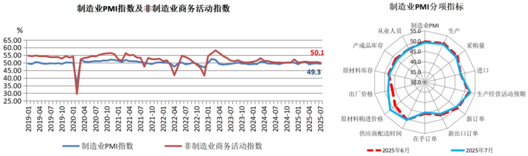 7月份,制造业采购经理指数(PMI)、非制造业商务活动指数和综合PMI产出指数分别为49.3%、50.1%和50.0%,较上月分别下降0.4、0.4和0.1个百分点,季节性因素和极端天气影响下,7月制造业PMI供需两端同时回缩。从供给端来看,7月是传统制造业生产淡季,生产分项较上月回落0.5个百分点至50.5%,但仍处于扩张区间。生产活动经营预期分项较上月上升0.6个百分点,表明企业预期向好,从需求端来看,在“抢出口”退坡下外需回落,7月新订单分项较上月下降0.8个百分点至49.4%,新出口订单较上月下降0.6个百分点至47.1%,均位于收缩区间。而消费品“以旧换新”政策下耐用品消费需求持续释放,或透支未来消费需求,一定程度制约内需延续改善。整体来看,7月制造业PMI显示出“供需两弱”的态势,下半年提振内需尤为关键。