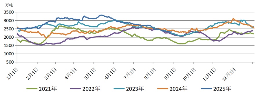 图8 2021—2025年北方九港合计库存