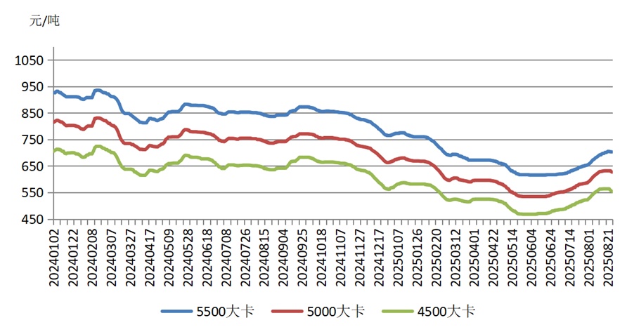 但8月下旬内贸煤市场价格已开启回调,进口市场热度也随之回落,市场交投减少,观望情绪增加,后续进口煤持续上涨难度较大。贸易商出货压力增大,部分招标价格倒挂,短期内价格或呈小幅下调走势。