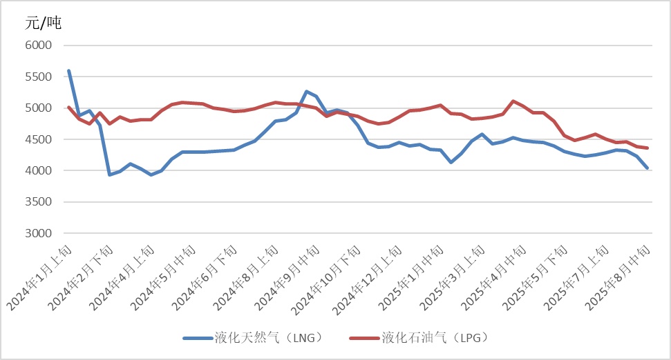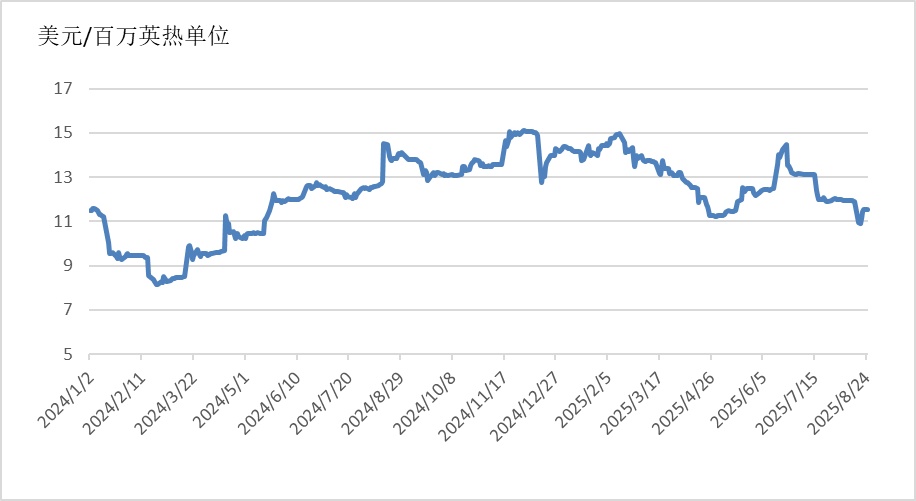 截至8月25日,普氏日韩LNG(JKM)期货价格收于11.55美元/百万英热单位,月环比下降2.74%,相较2024年同期的13.82美元/百万英热单位,下降16.43%。